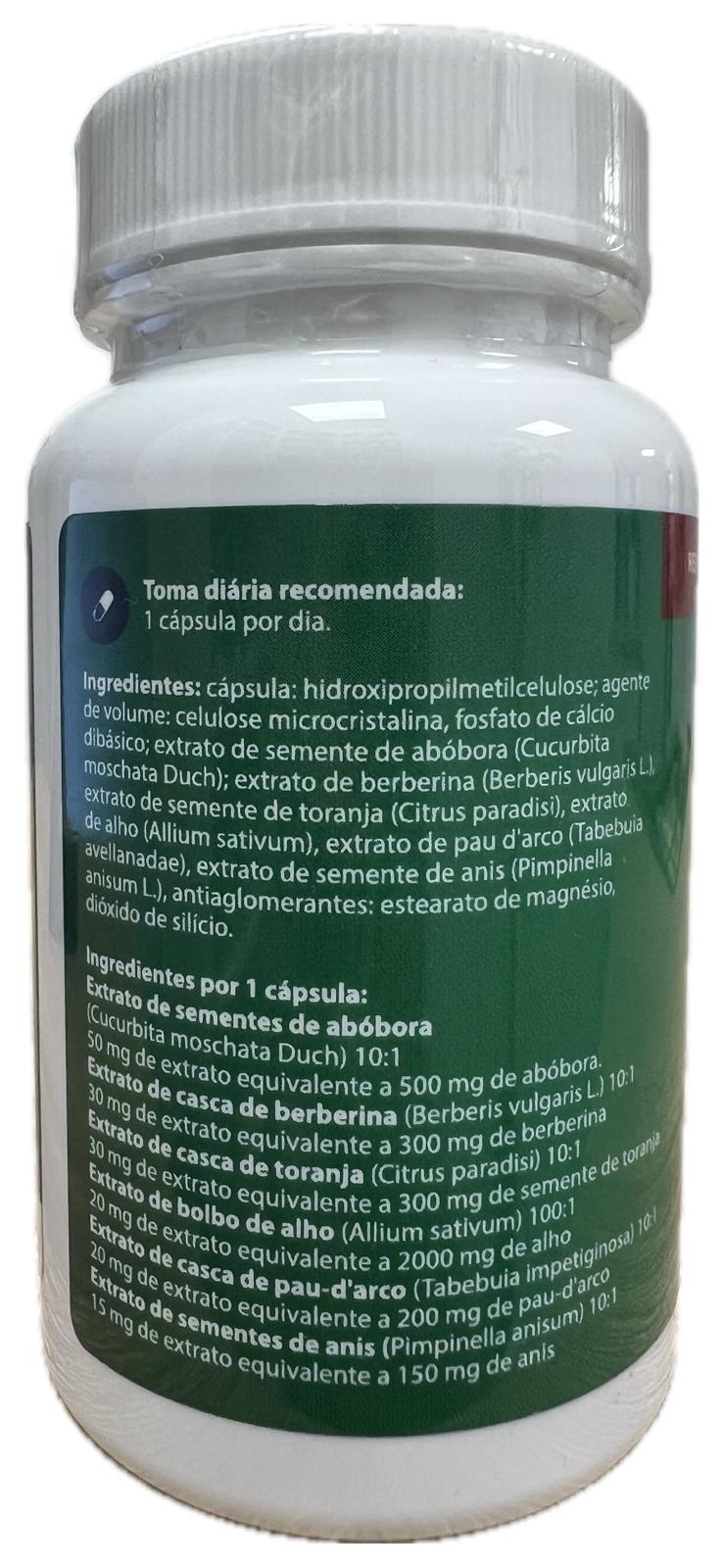 🧪 Ingredientes por cápsula Extrato de sementes de abóbora (Cucurbita moschata) Extrato de berberina (Berberis vulgaris) Extrato de semente de toranja (Citrus paradisi) Extrato de alho (Allium sativum) Extrato de pau d’arco (Tabebuia impetiginosa) Extrato de anis (Pimpinella anisum)